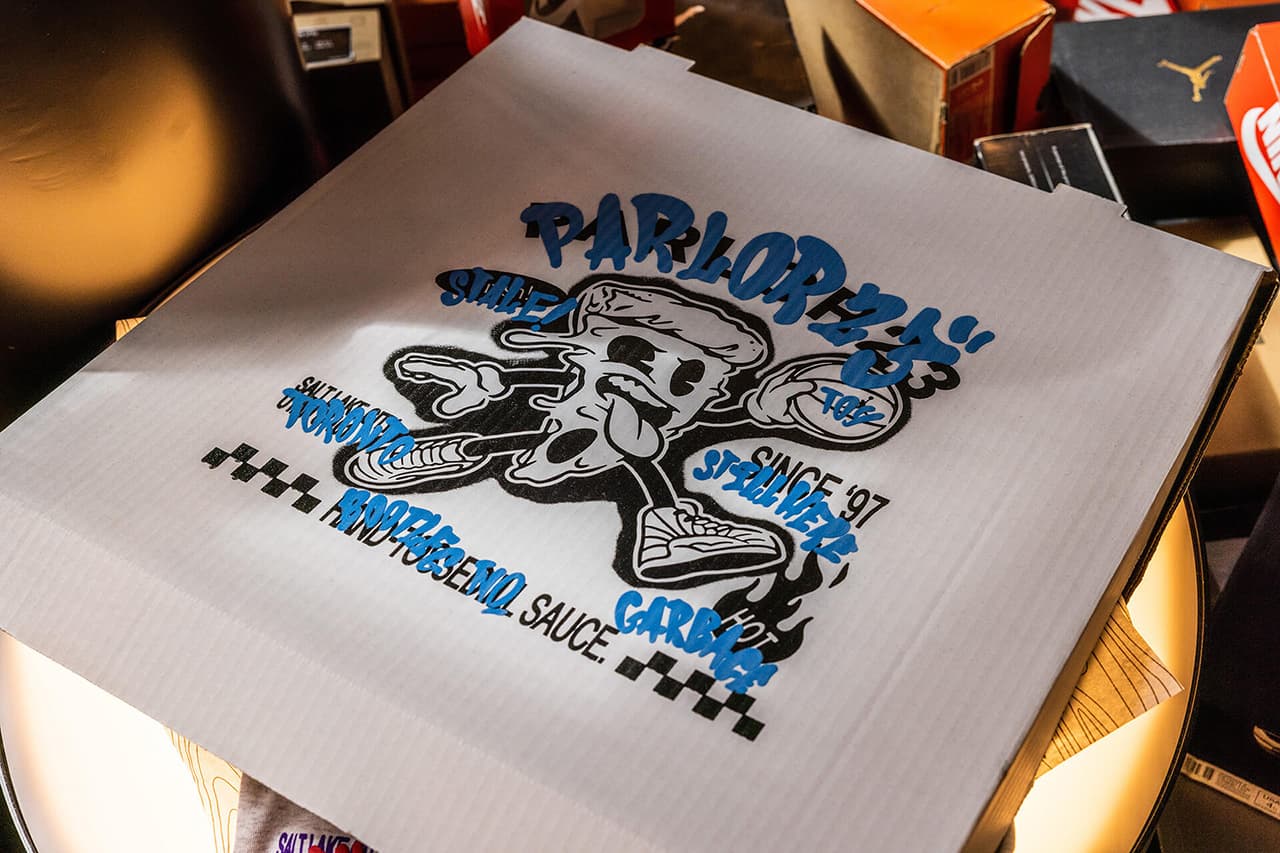 He was also the one behind the instant classic “Bootleg a Bootleg” line for which P23 decided to lift the graphic from Air Jordan’s most recent Allstar Weekend pop-up in SLC, which they had dubiously titled none other than “PARLOR23”. The OGs reclaimed their rightful name in the tradition of disrespected graffiti artists by going over the details in a sick hand style and replacing the jump man with a pissed-looking Pizza slice, fixing to dunk. Mastermind Jaron says it’s all love though, really.